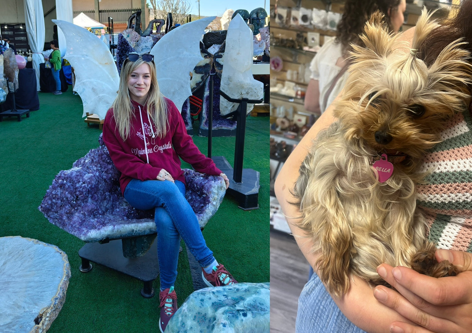 Hi, I’m Trisha, the heart behind Mainline Crystals, and this is our store mascot Bella, she loves to travel with me exploring the world and shopping for rocks, occasionally popping by the shop to snuggle our shoppers.