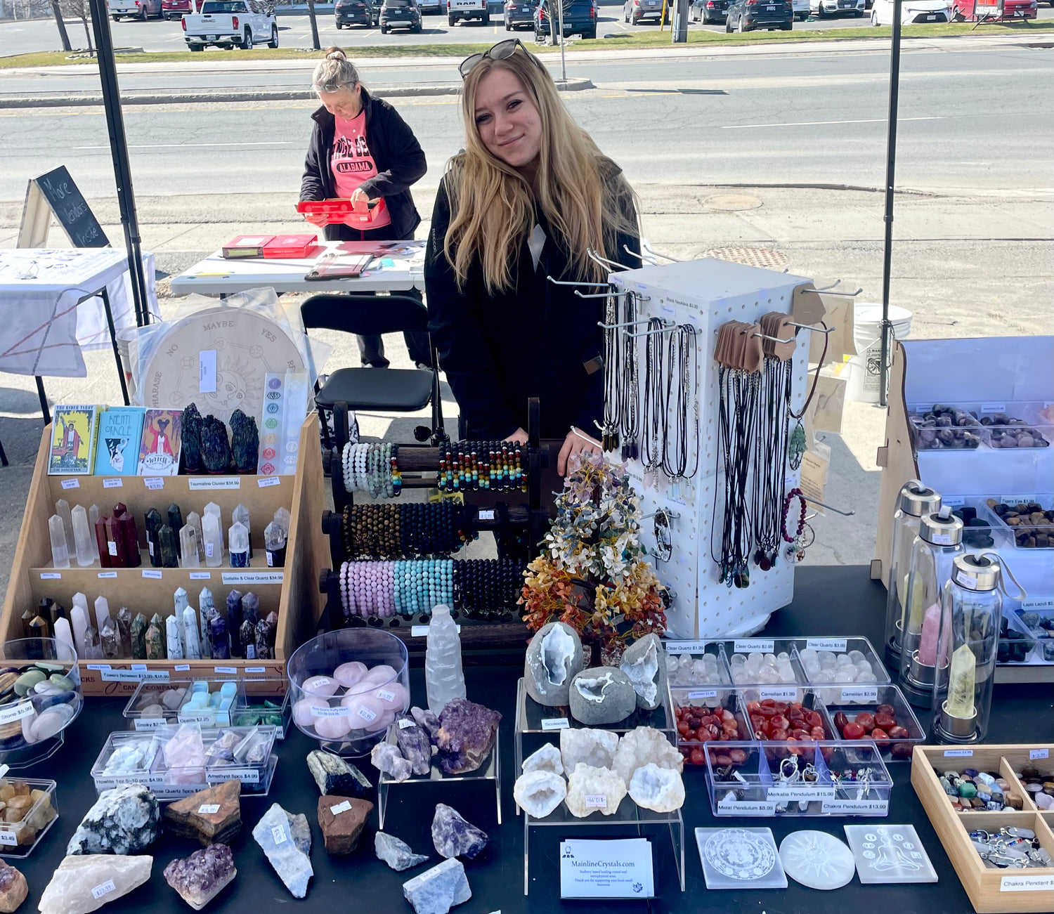 Mainline Crystals is filled with things Ive been dreaming up, a flower ceiling in the gift shop, a plant wall at the entrance and in the change room, a big neon sign, potion-making section, and every crystal I could think of (well, get my hands on). I couldn't find affordable books, moccasins, boho clothing, and things of the sort in my city so I added those to the gift shop! Anything Sudbury is missing I want to have or eventually make possible.