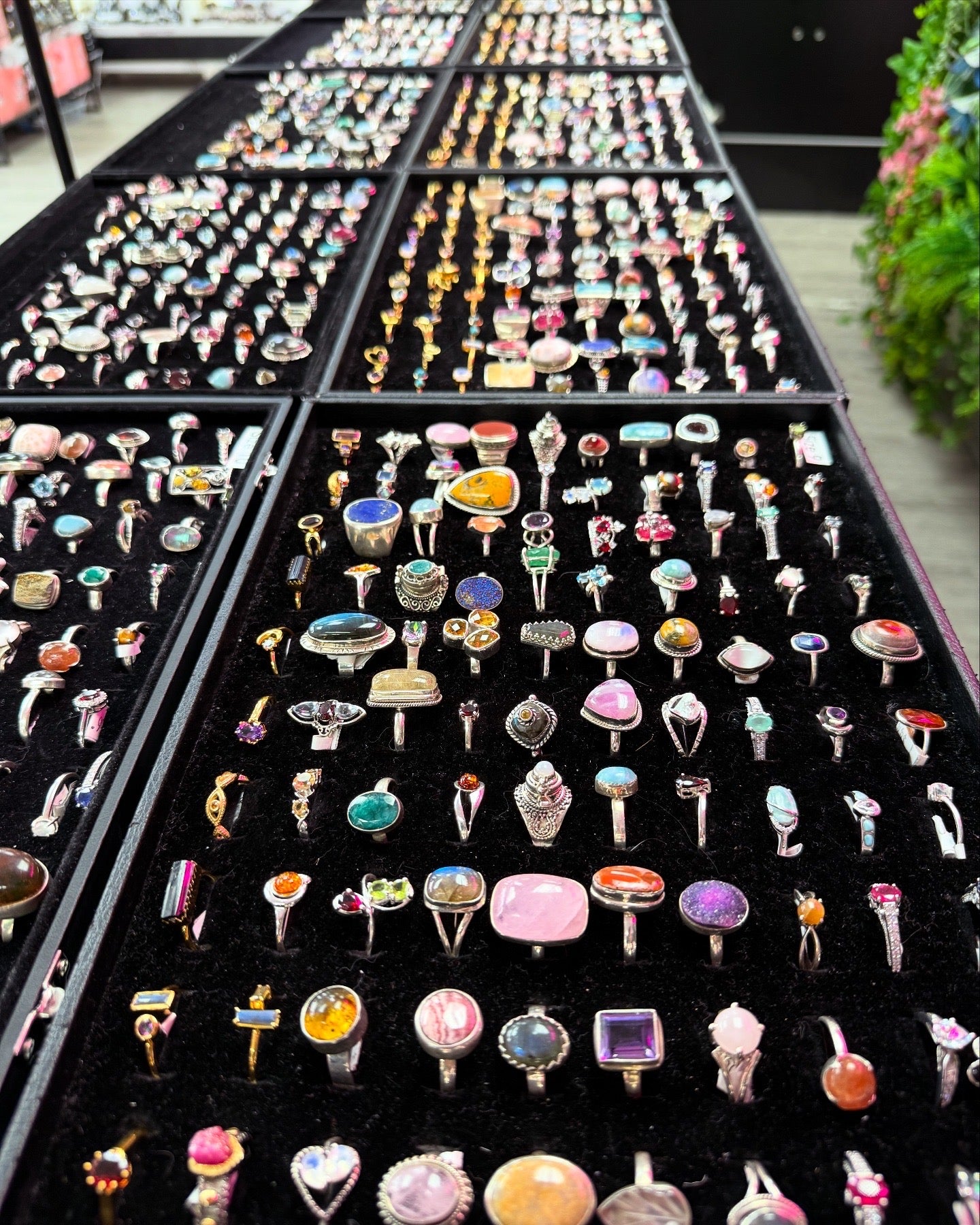 Our ring trays are packed with magic! Sizes 3 to 14 in Sterling Silver, Gold Plated, Alloy, and even full crystal styles. Whether you’re into flashy, chunky, dainty, or earthy, there’s a ring (or five) waiting for you to try on!