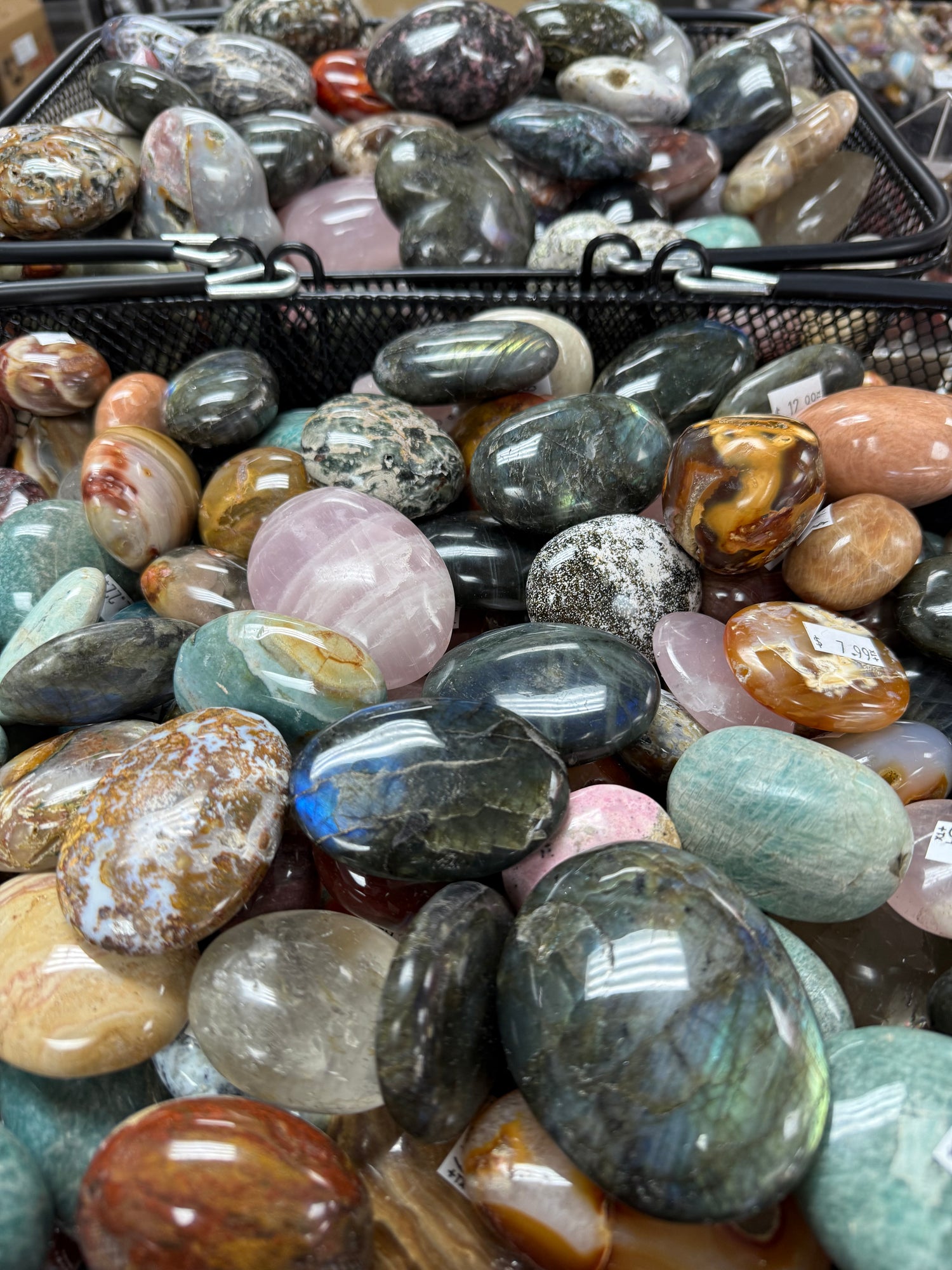 Hundreds of palm stones in every texture, colour, and energy you can imagine, smooth, soothing, and perfect for holding during meditation or keeping in your pocket. Dig through our multiple baskets and find the one that feels just right for you!