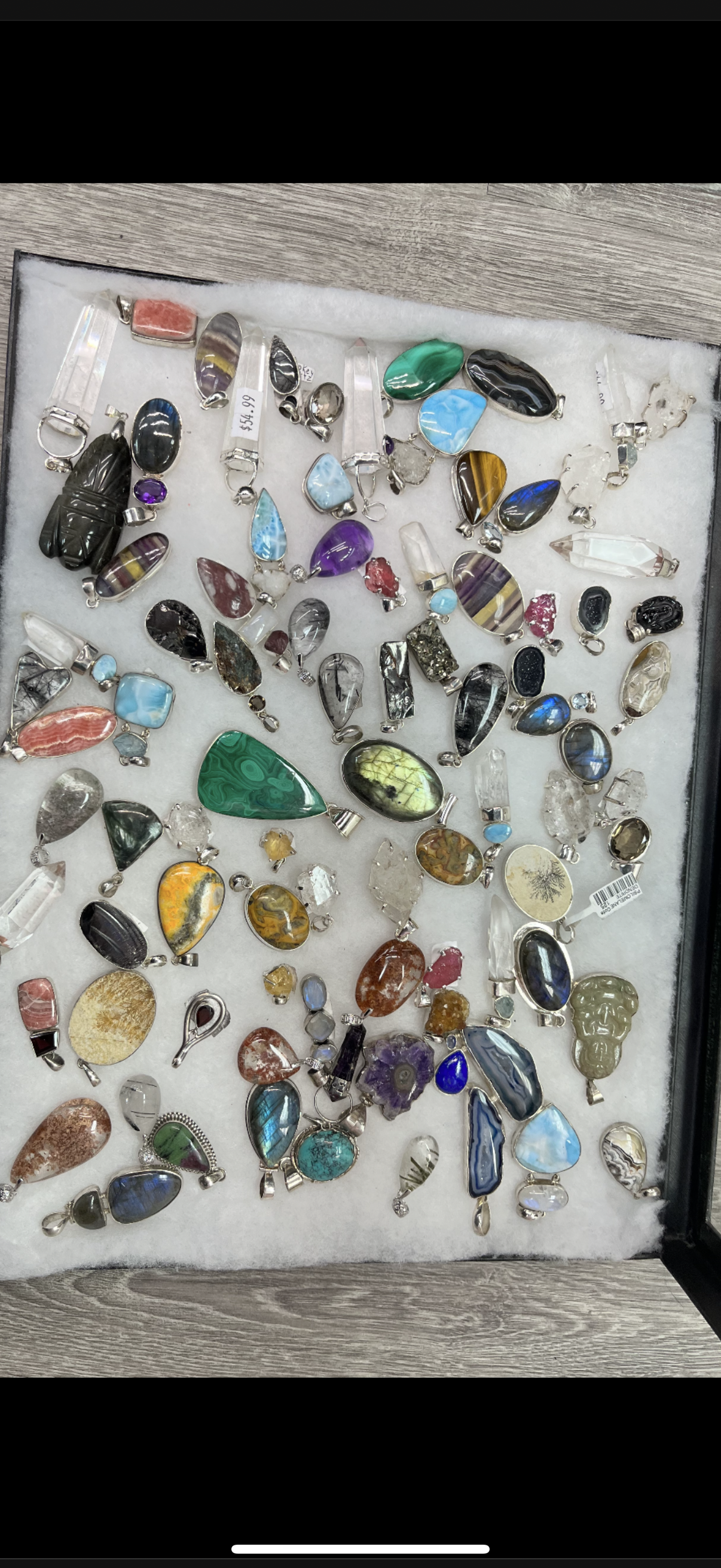A showcase of stunning crystal pendants set in sterling silver and other unique settings. From classic favorites to rare one-of-a-kinds, these pieces are made to be worn, gifted, and treasured.
