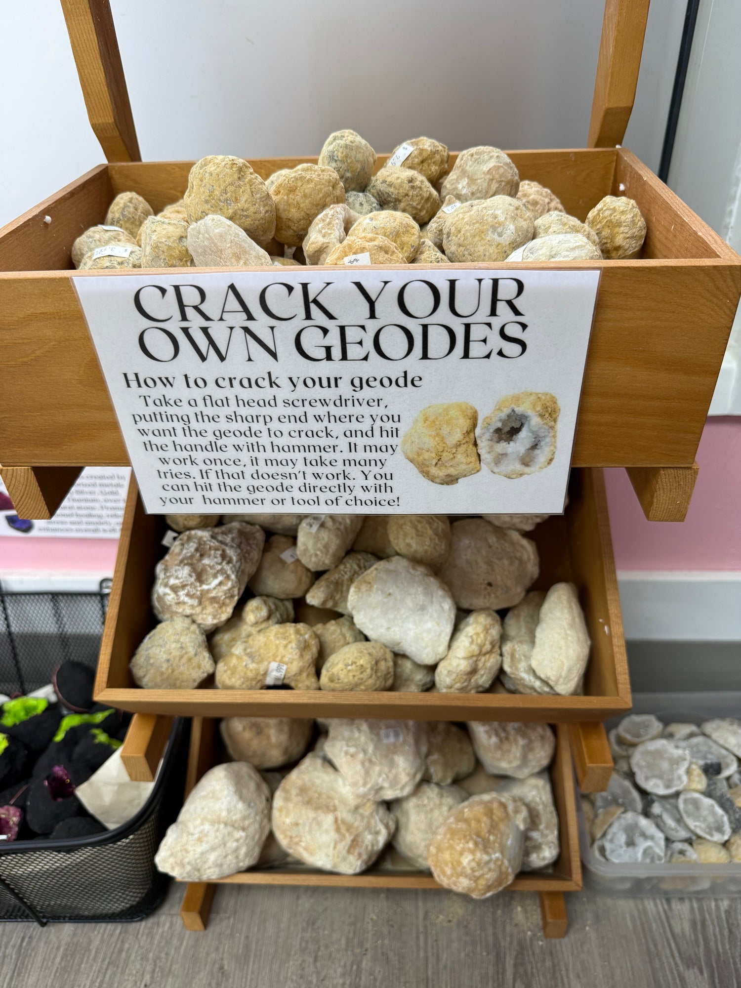 Grab a geode, take it home, and crack it open to reveal the crystal magic inside! Each piece is a total surprise, some sparkle, some shimmer, all are fun.