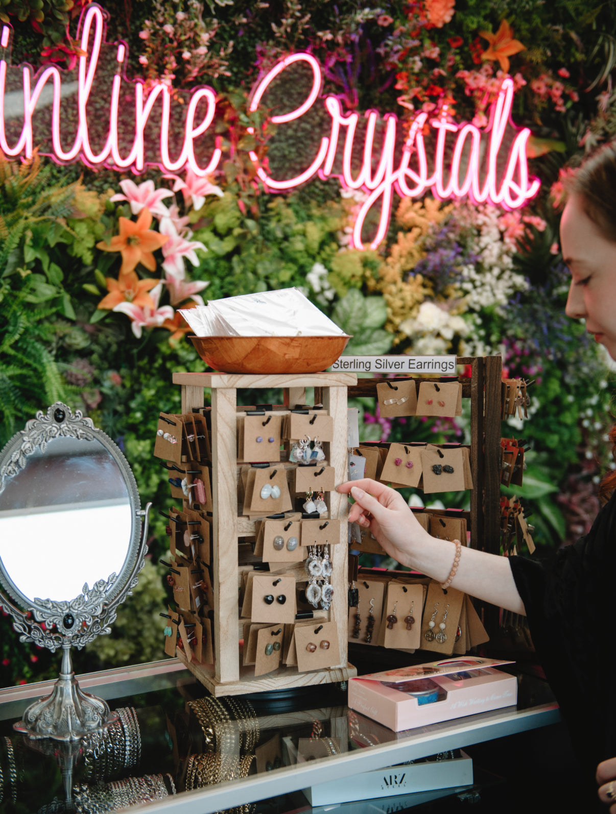 An entire wall dedicated to crystal bracelets, displayed on our handmade Moss Agate bracelet stands! This section is one of the most-loved spots in the shop, from rare finds to classic staples we’ve got them all!